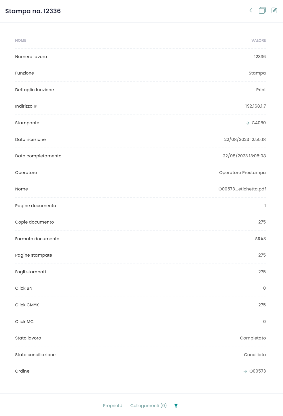 Esempio di una schermata di un lavoro di stampa