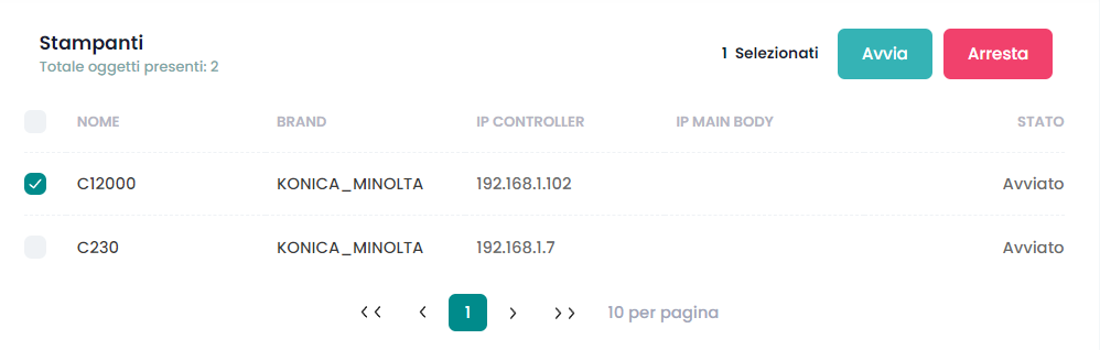 Nella sezione SNMP Manager è possibile abilitare o arrestare il processo di monitoraggio delle stampanti censite.